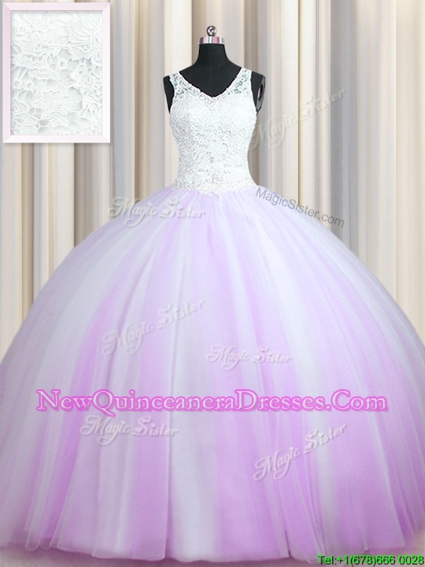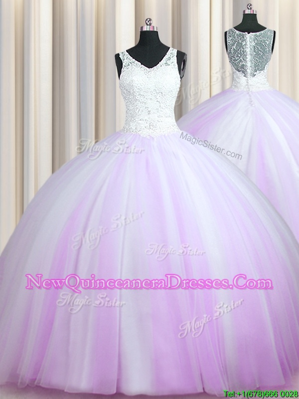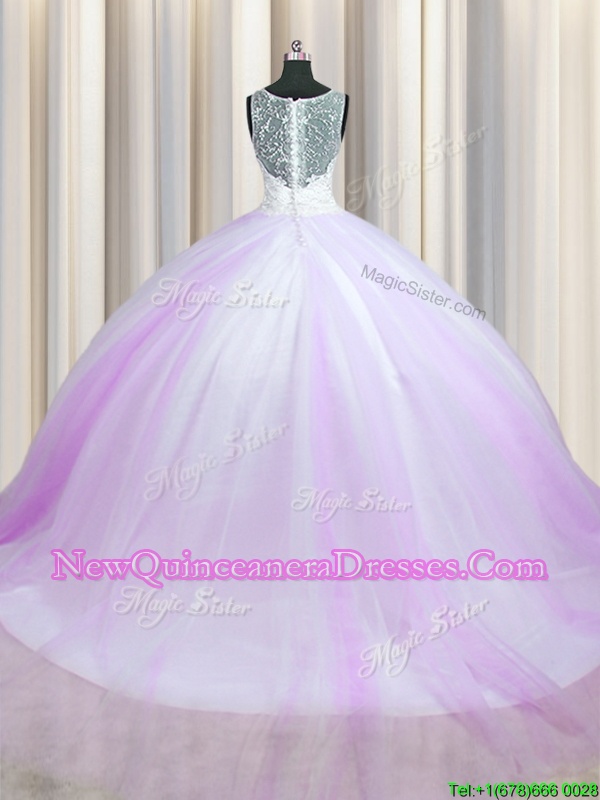 V Neck Zipper Up With Train Zipper Vestidos de Quinceanera Lilac and In for Military Ball and Sweet 16 and Quinceanera withBeading Brush Train#PSSW0602-7PRT