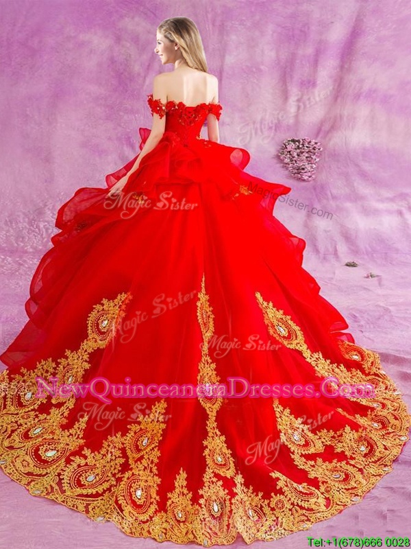 Modest Red Off The Shoulder Neckline Beading and Appliques and Ruffles Vestidos de Quinceanera Sleeveless Lace Up#YCQD0105PRT