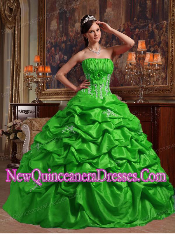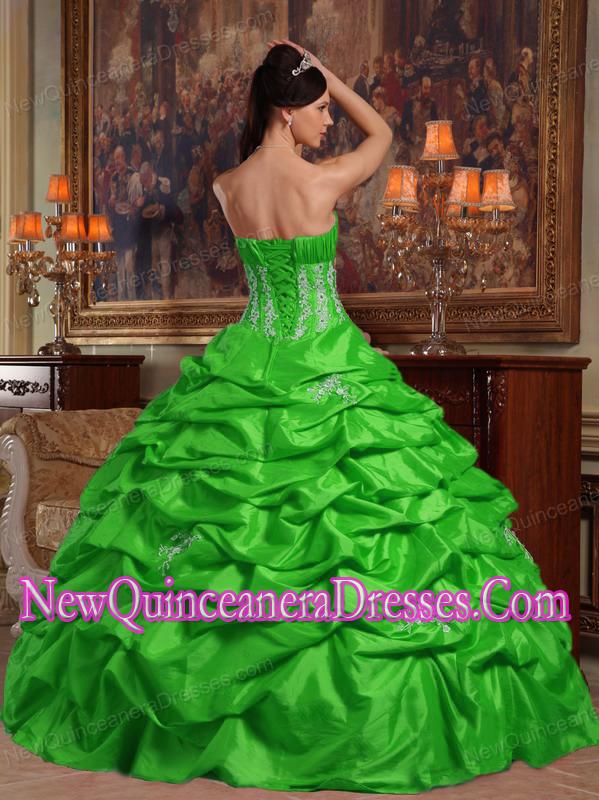 Neckline : StraplessShown Color : GreenSilhouette : Ball GownsSleeve Length : sleevelessHemline : floor-lengthBack Detail : Lace upFabric : TaffetaEmbellishment : Appliques,Pick-upsOccasion : Military Ball,Sweet 16,QuinceaneraSeason : Spring,Summer,Fall,Winter