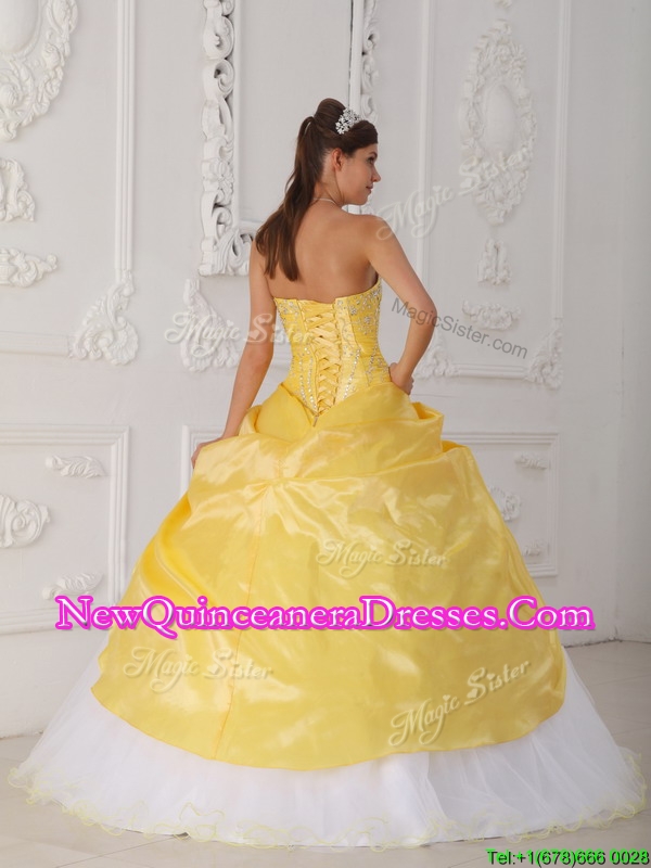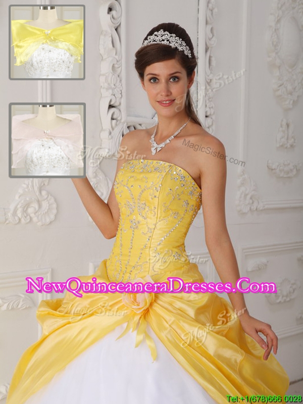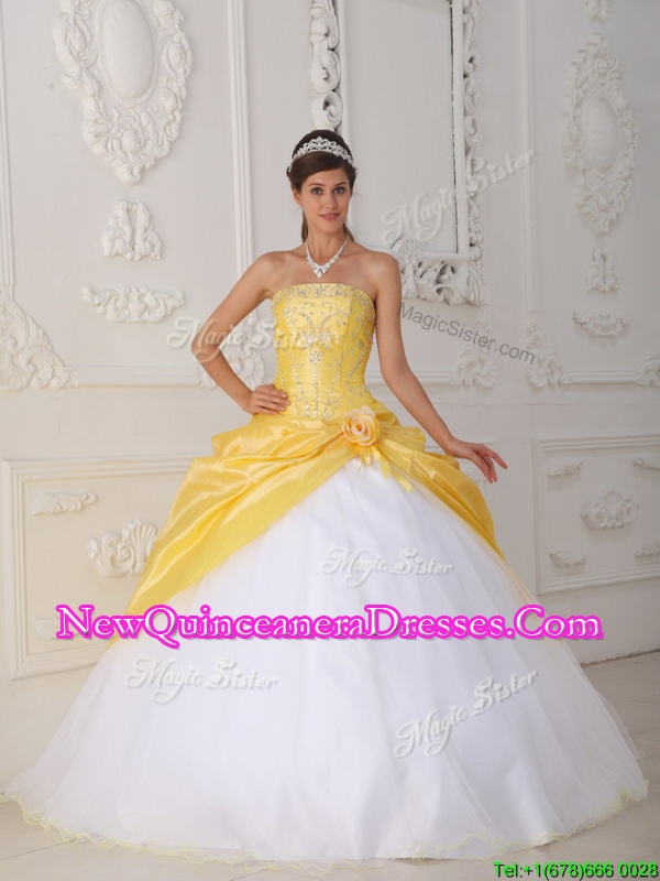 Neckline : StraplessShown Color : Yellow And WhiteSilhouette : Ball GownsSleeve Length : sleevelessHemline : floor-lengthBack Detail : Lace upFabric : Organza,TaffetaEmbellishment : Appliques,Hand-made FlowerOccasion : Formal Evening,Military Ball,Quinceanera