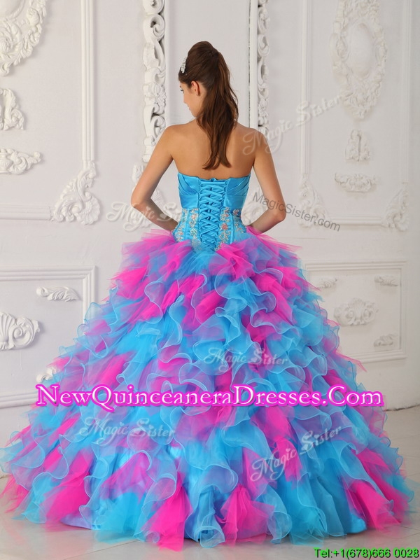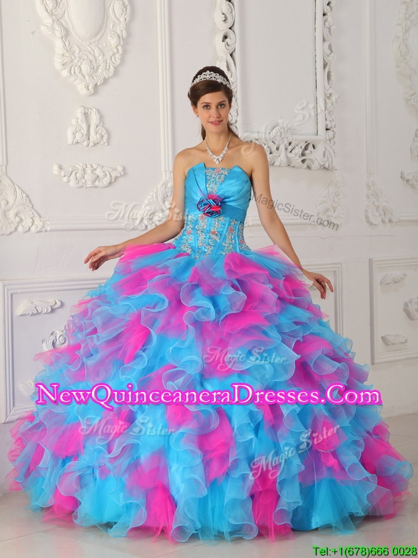 Neckline : StraplessShown Color : Multi-colorSilhouette : Ball GownsSleeve Length : sleevelessHemline : floor-lengthBack Detail : Lace upFabric : OrganzaEmbellishment : Appliques,Hand-made FlowerOccasion : Formal Evening,Military Ball,QuinceaneraSeason : Spring,Summer,Fall,Winter