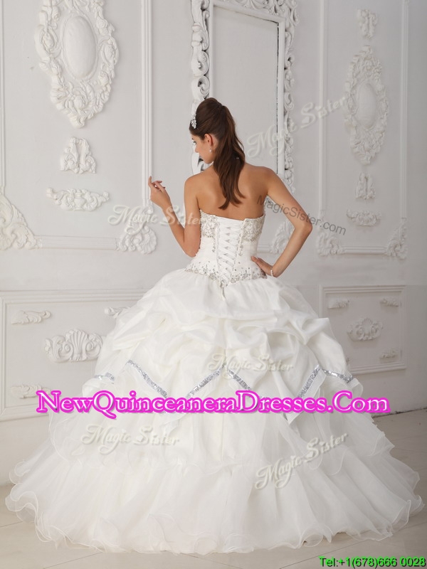 Neckline : SweetheartShown Color : WhiteSilhouette : Ball GownsSleeve Length : sleevelessHemline : floor-lengthBack Detail : Lace upFabric : Organza,TaffetaEmbellishment : BeadingOccasion : Formal Evening,Military Ball,QuinceaneraSeason : Spring,Summer,Fall,Winter